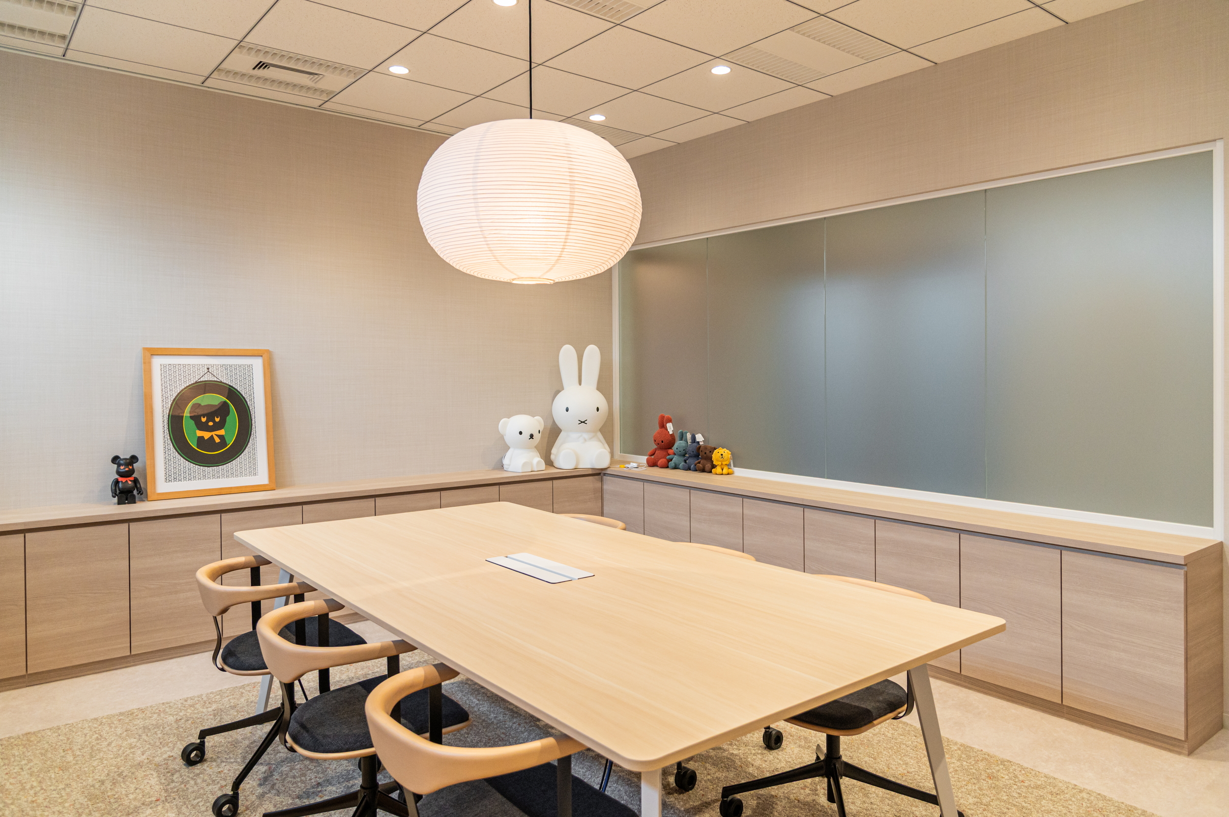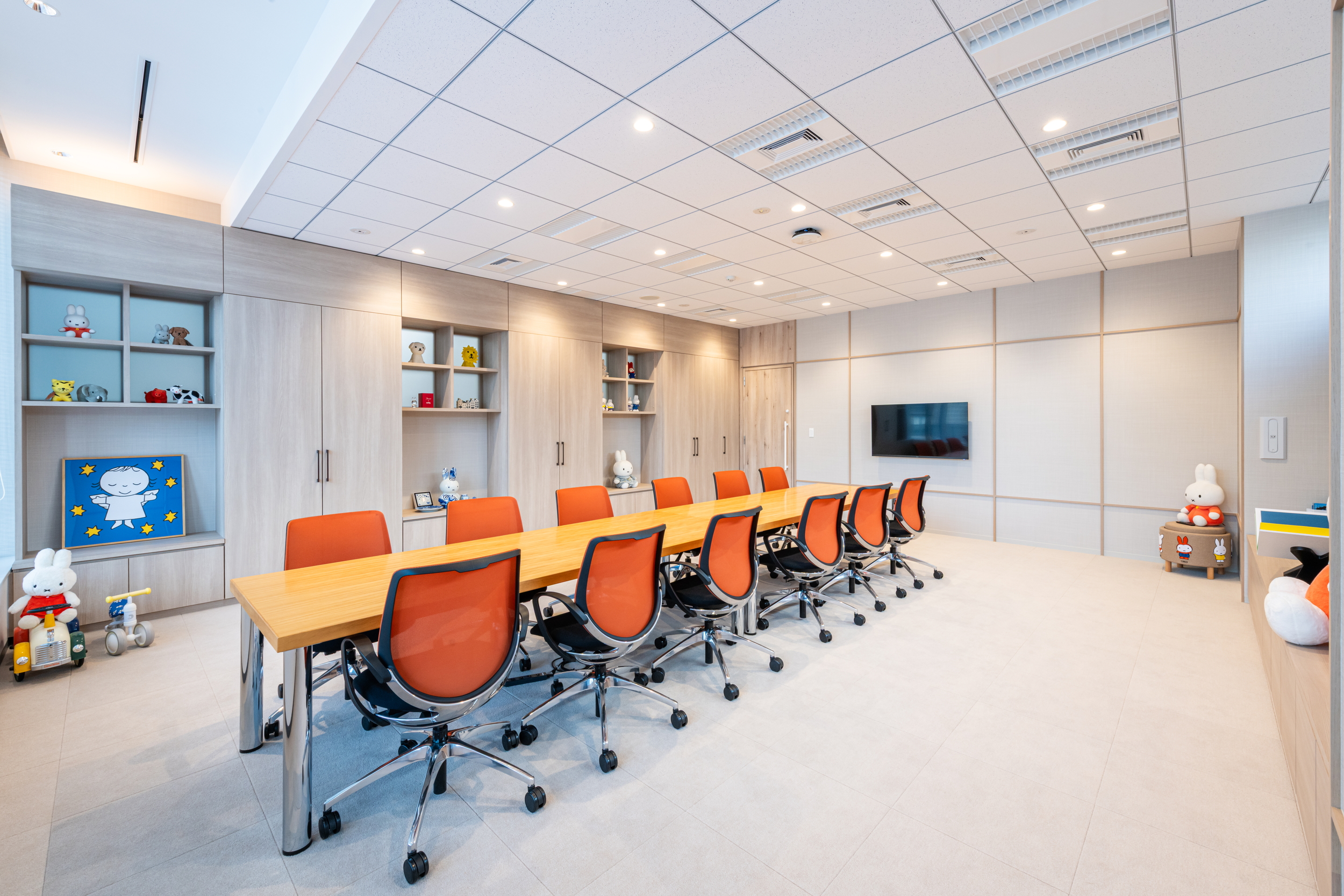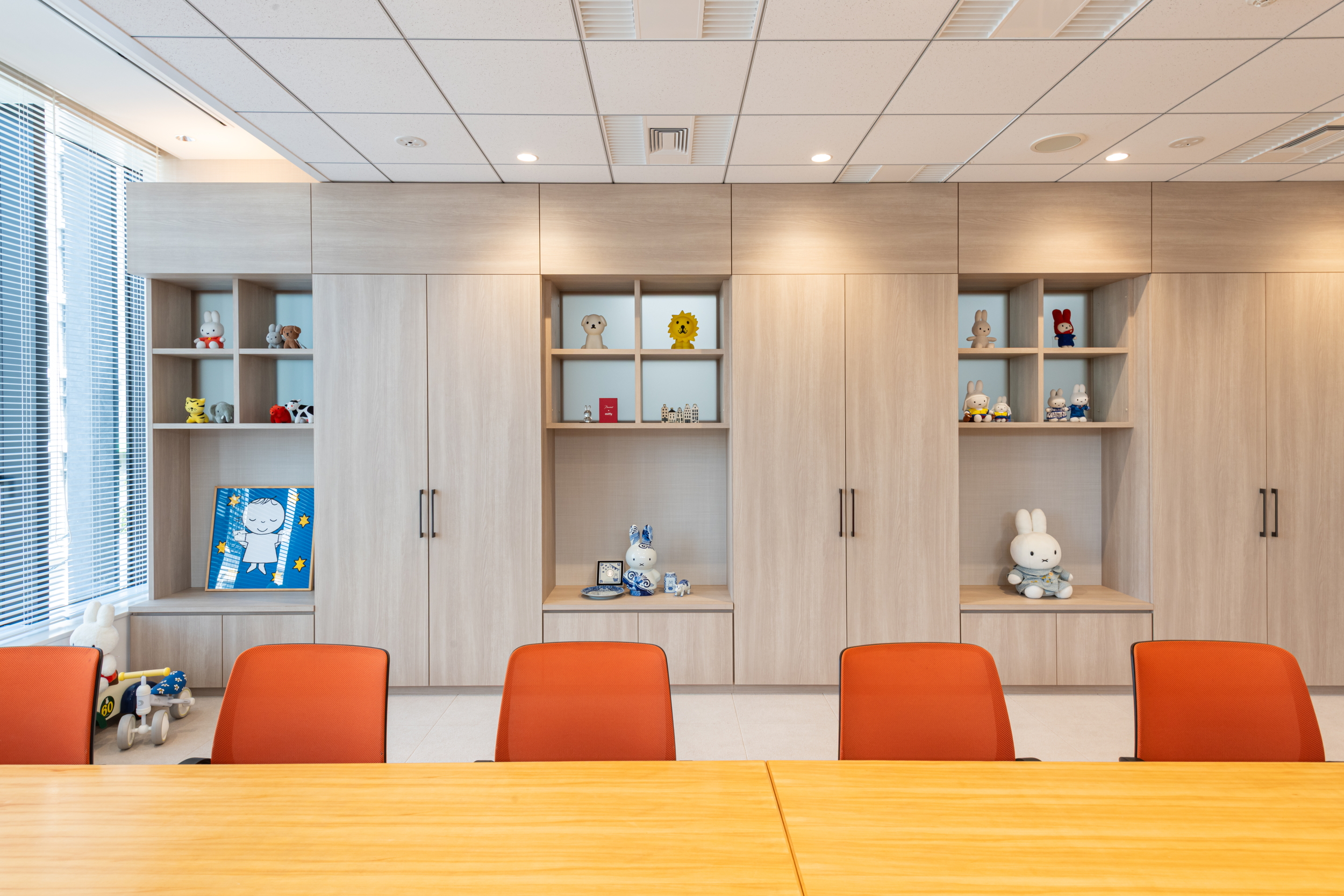 執務室内は壁一面に大型の収納を設置し、業務効率と利便性を担保しました。