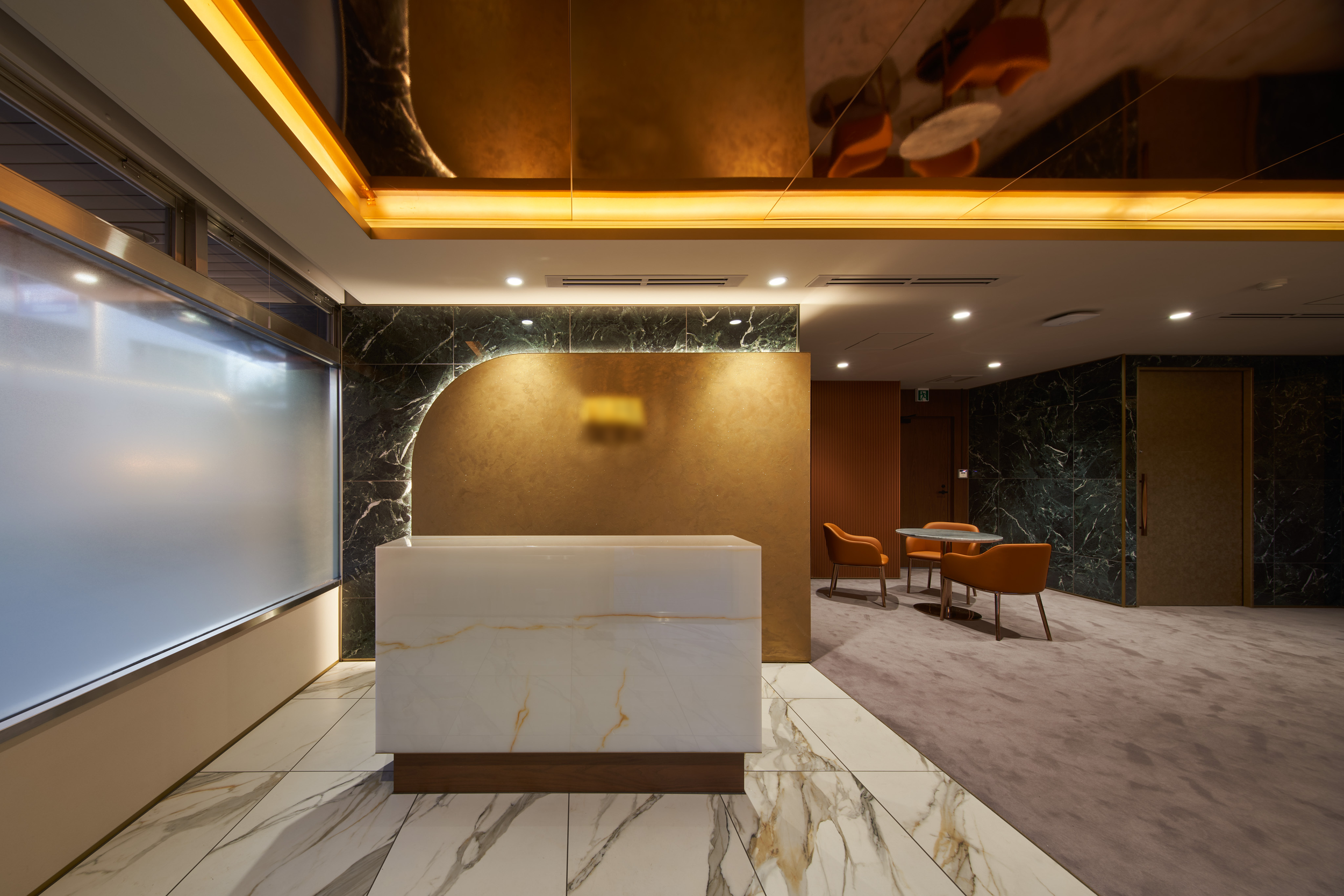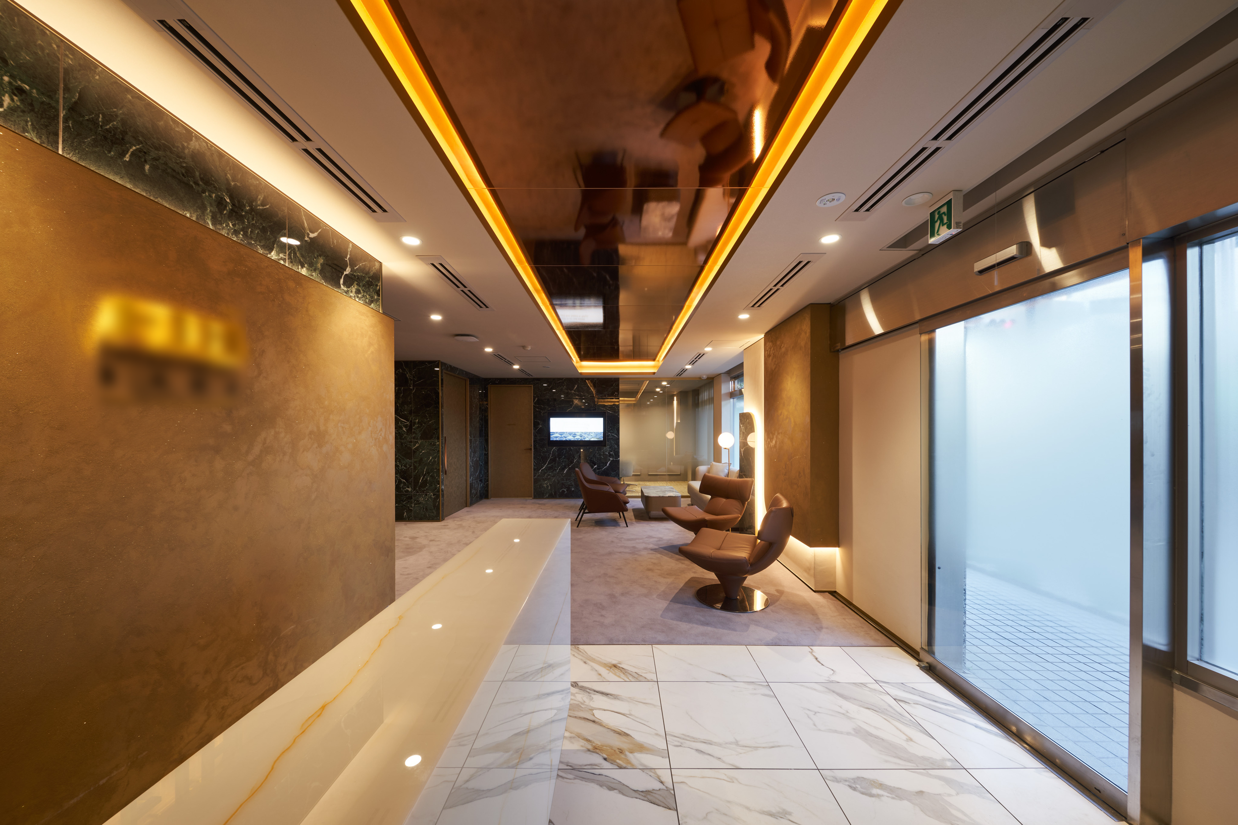 エントランスの受付台には大理石を、壁にはイタリア製の塗料・石材を使用。