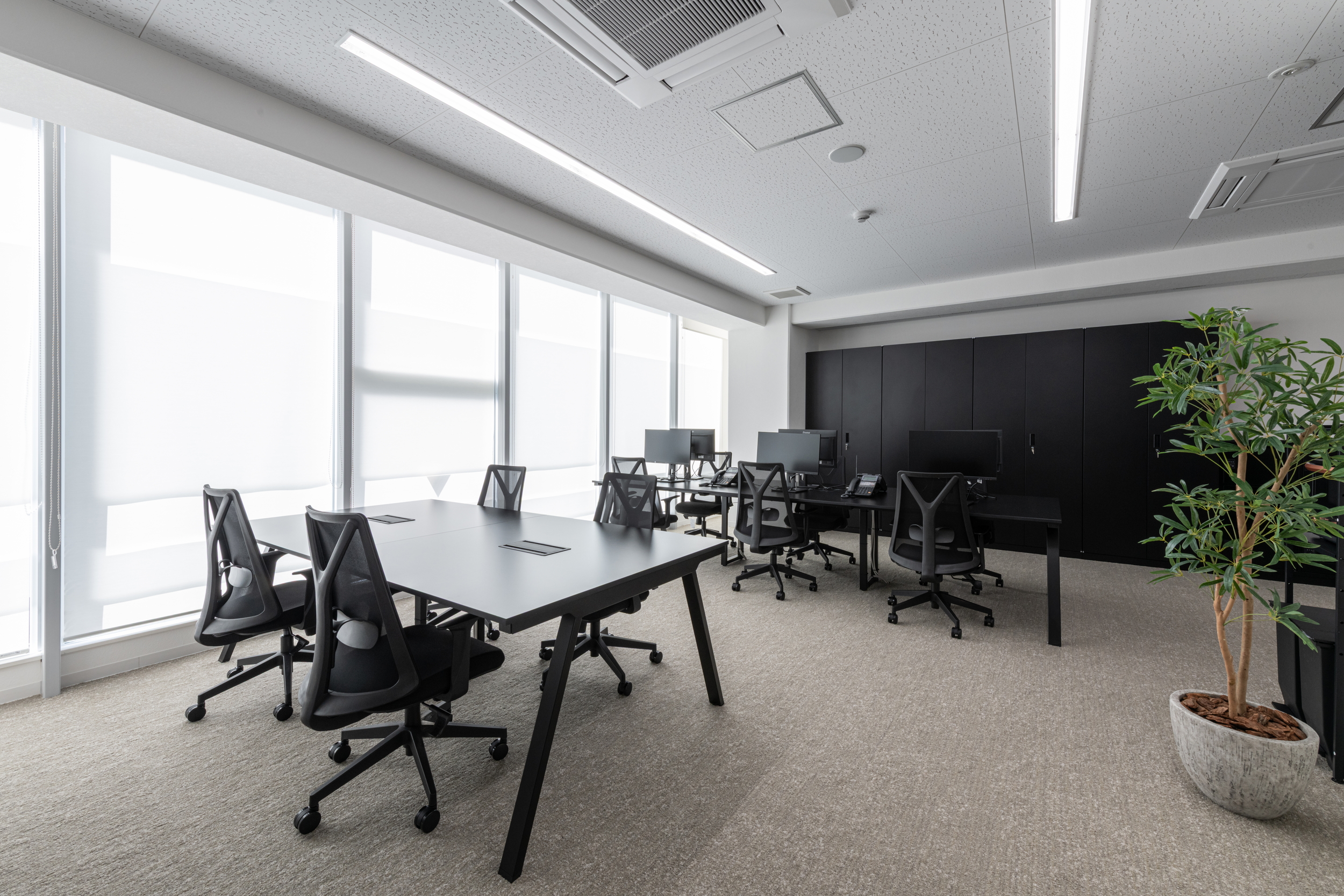 執務エリアはホワイトやベージュを基調とした空間とし、什器をブラックで統一。