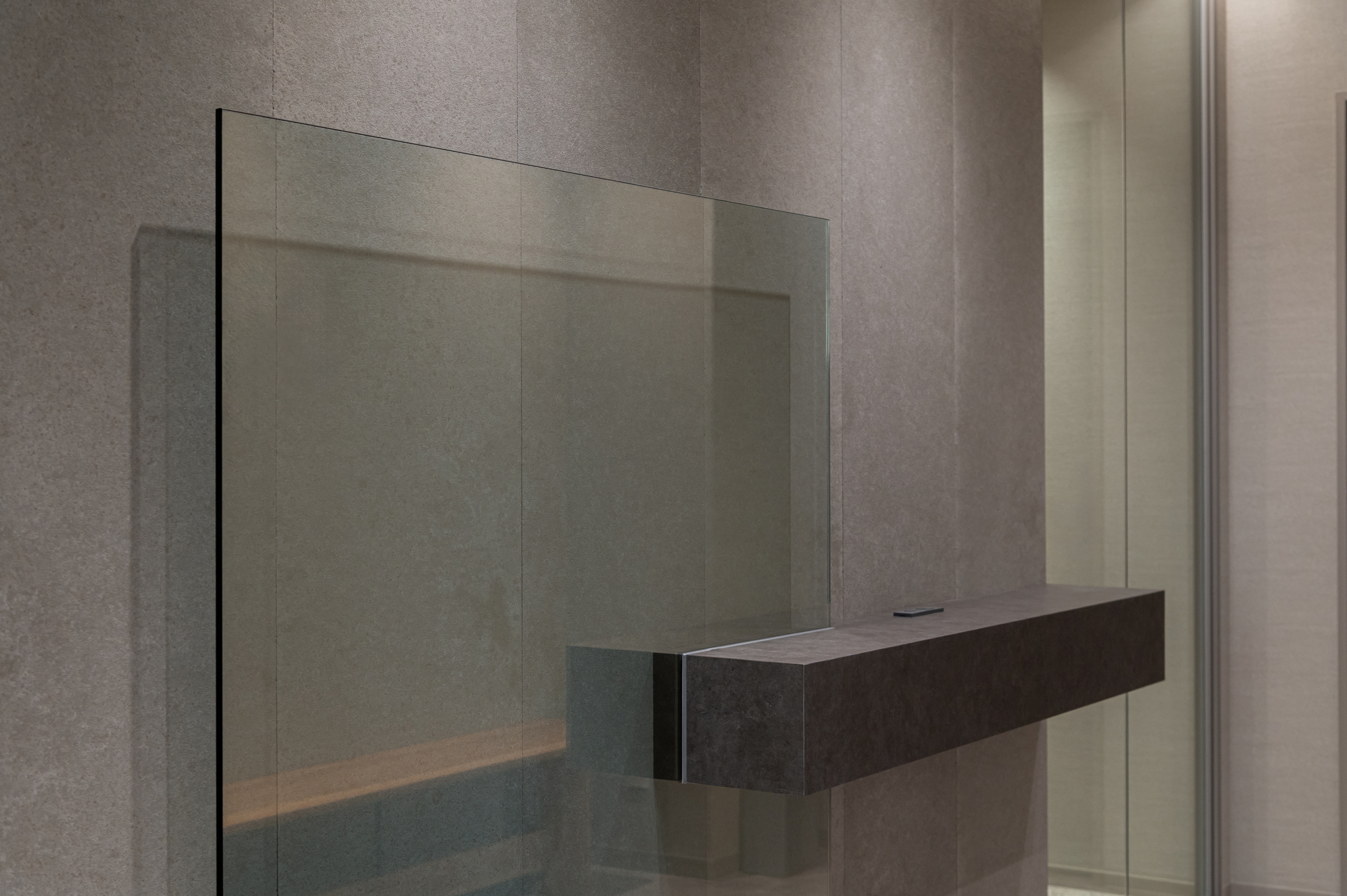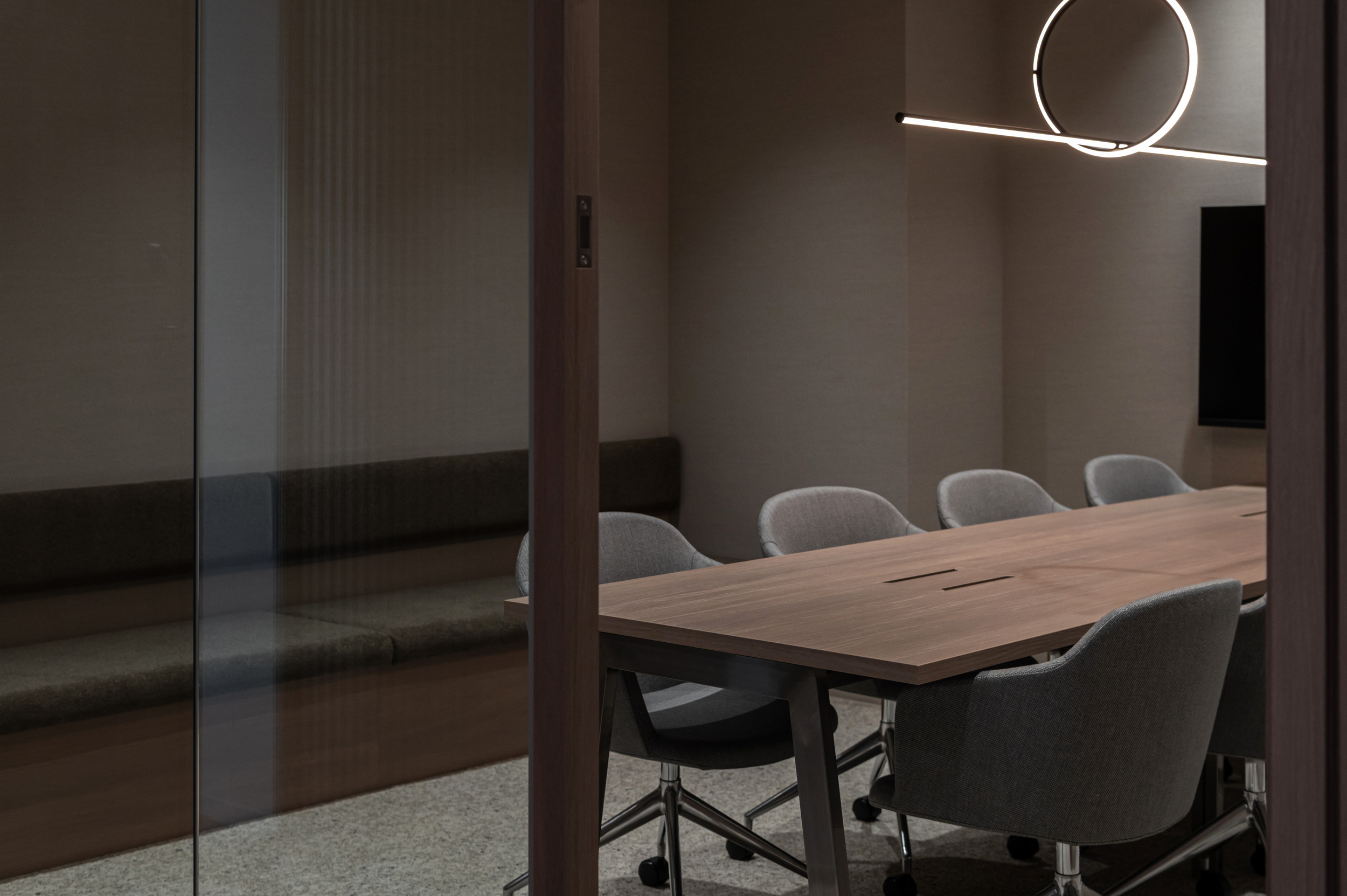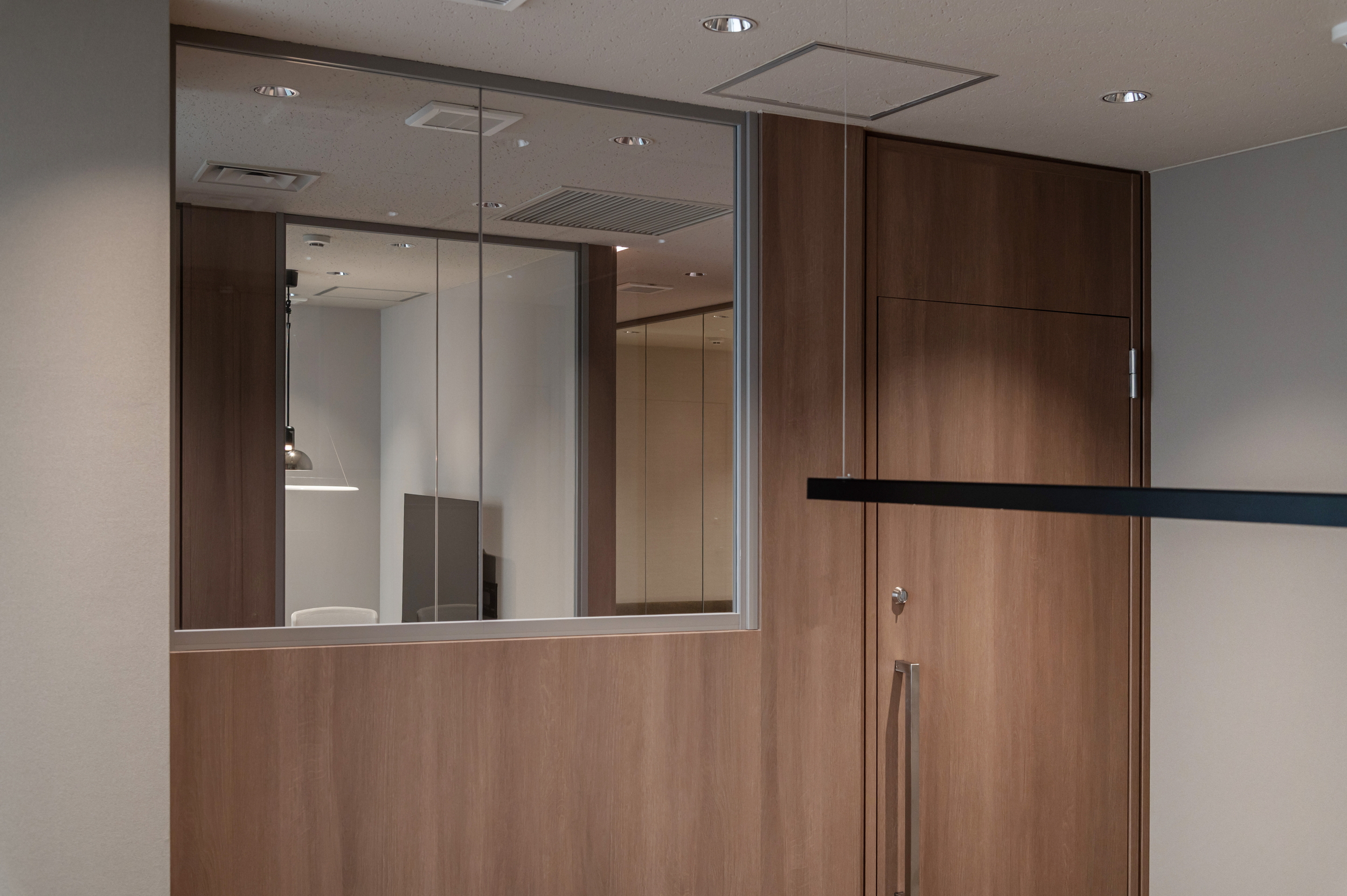 柔らかな木目の色調で統一感を持たせつつ、ガラス壁を取り入れているのがポイントです。