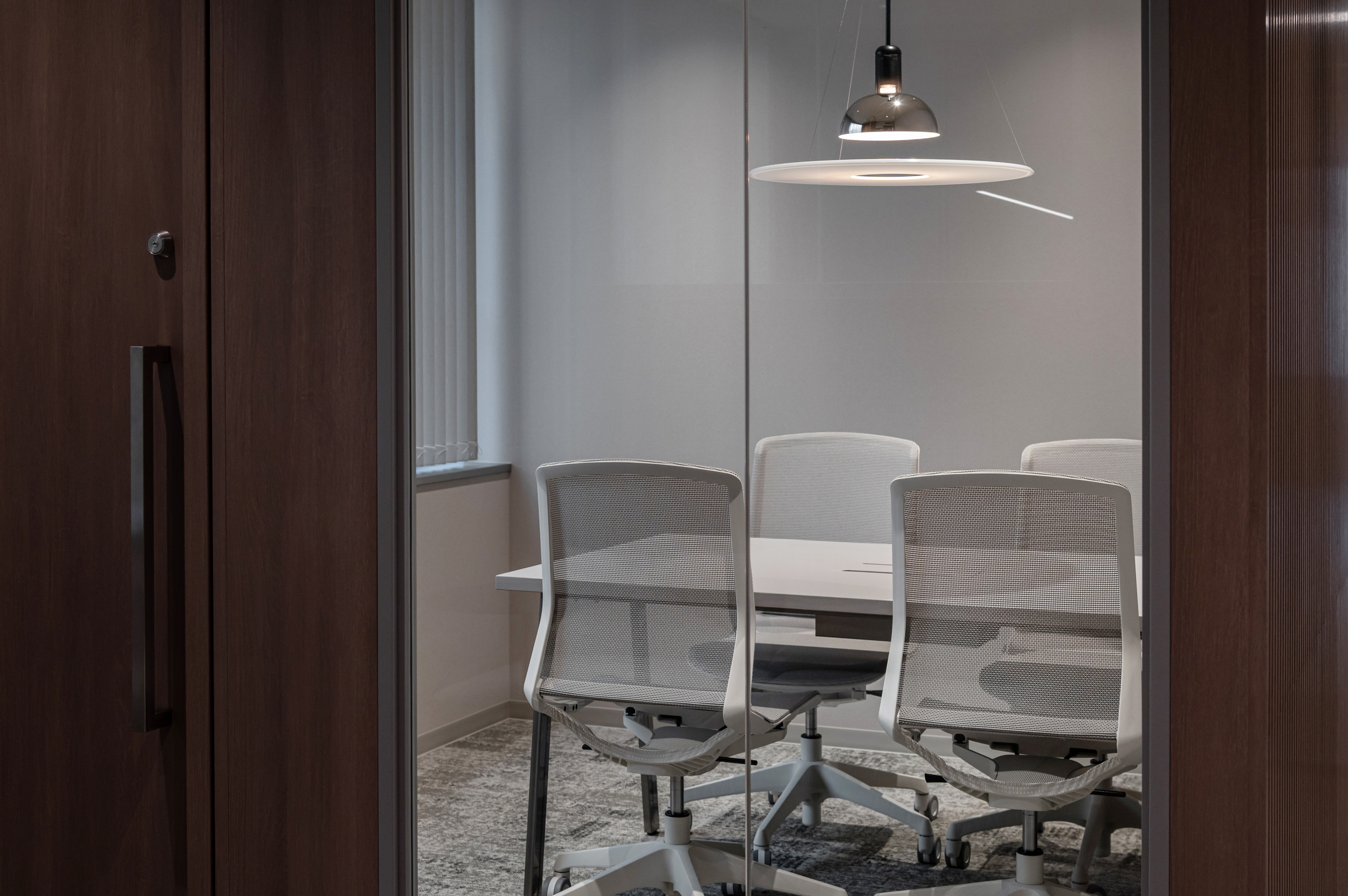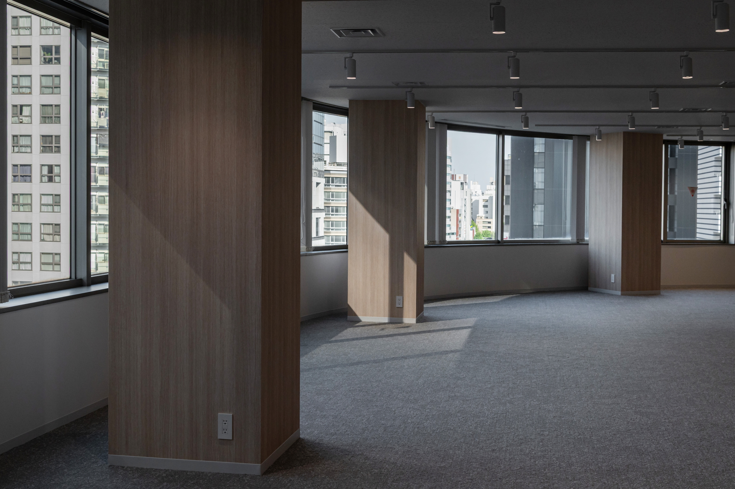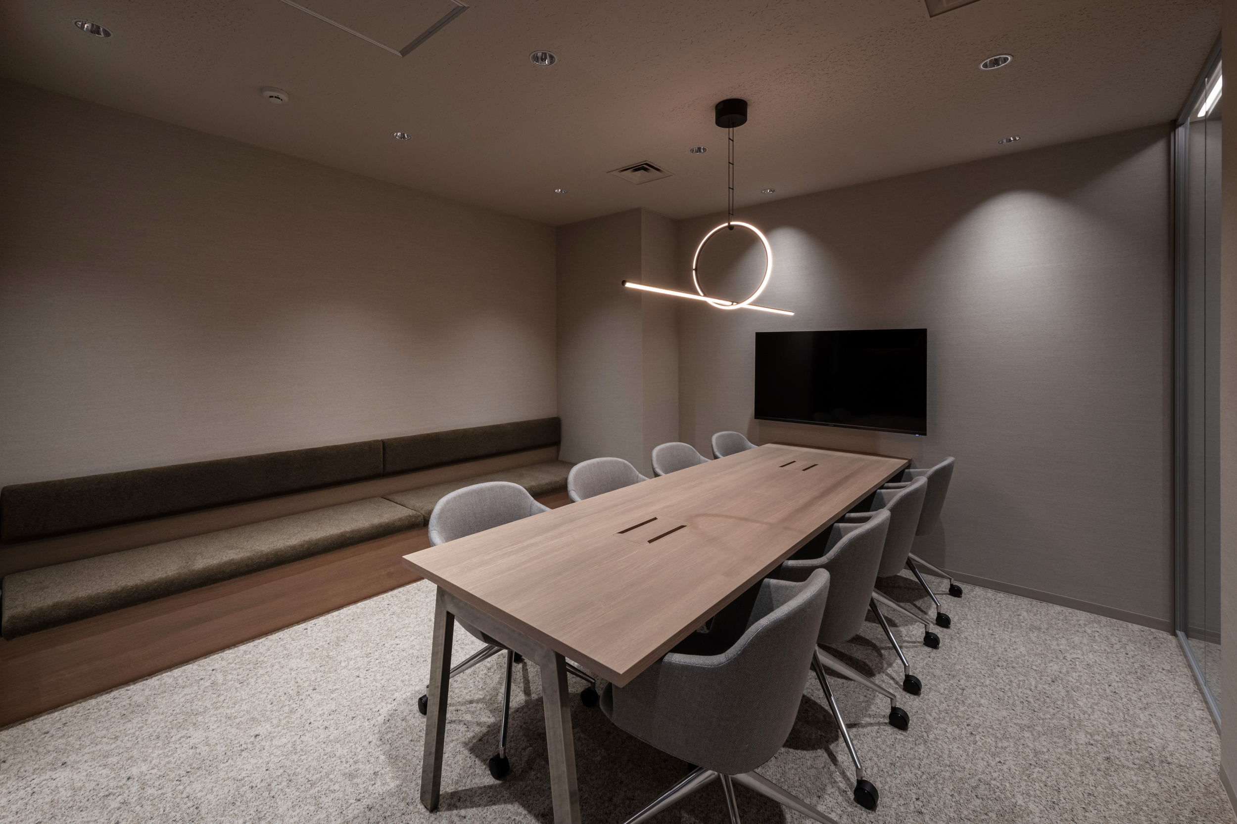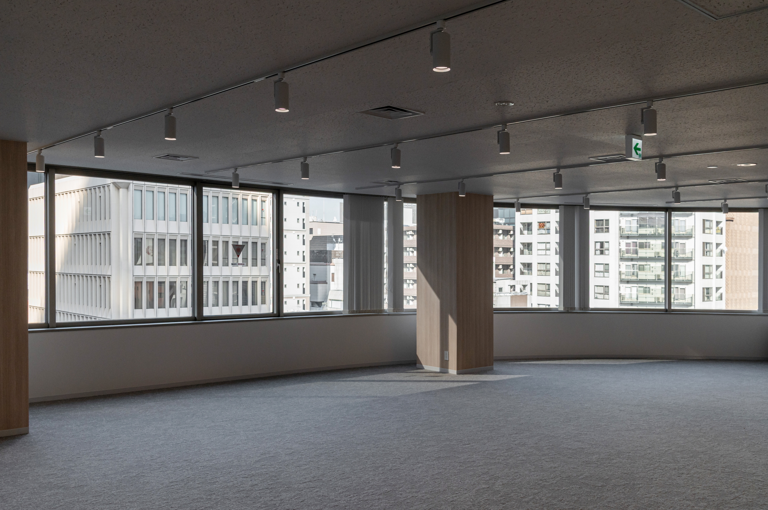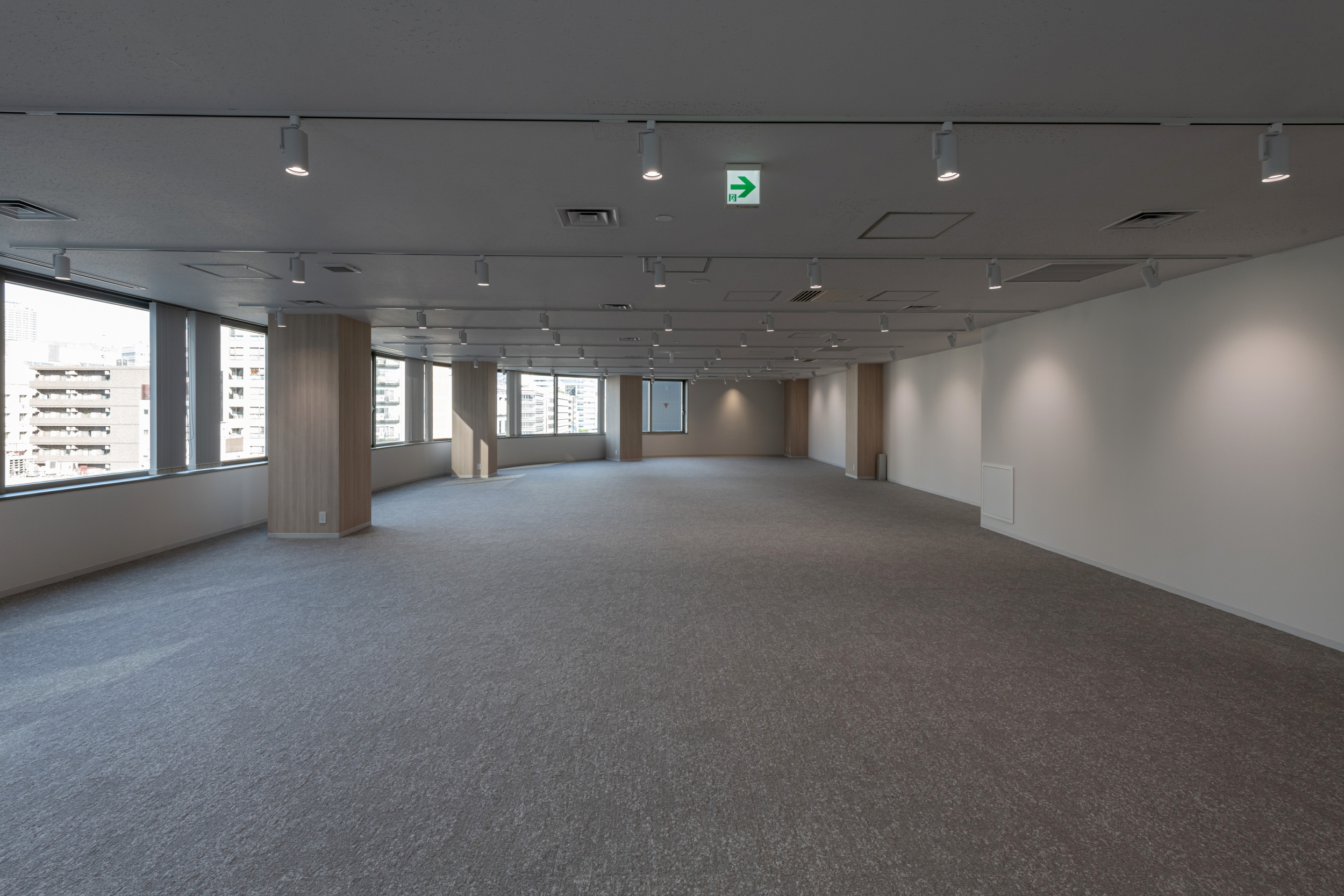 執務エリアは自由にレイアウトできるゆとりある空間とし、調光・調色可能な照明を導入。
