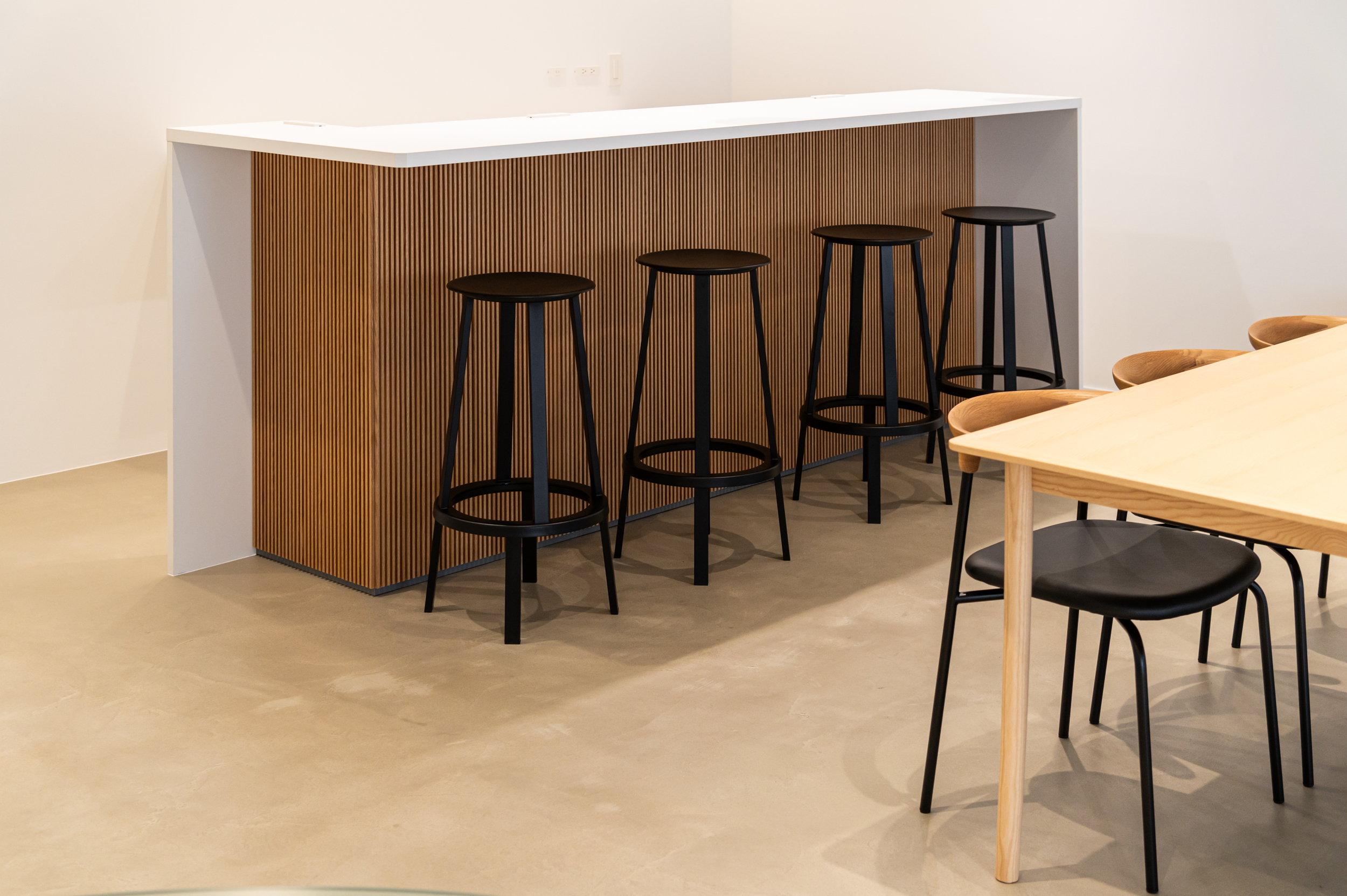白を基調とした空間に、ナチュラルウッドやモルタルを採用しました。