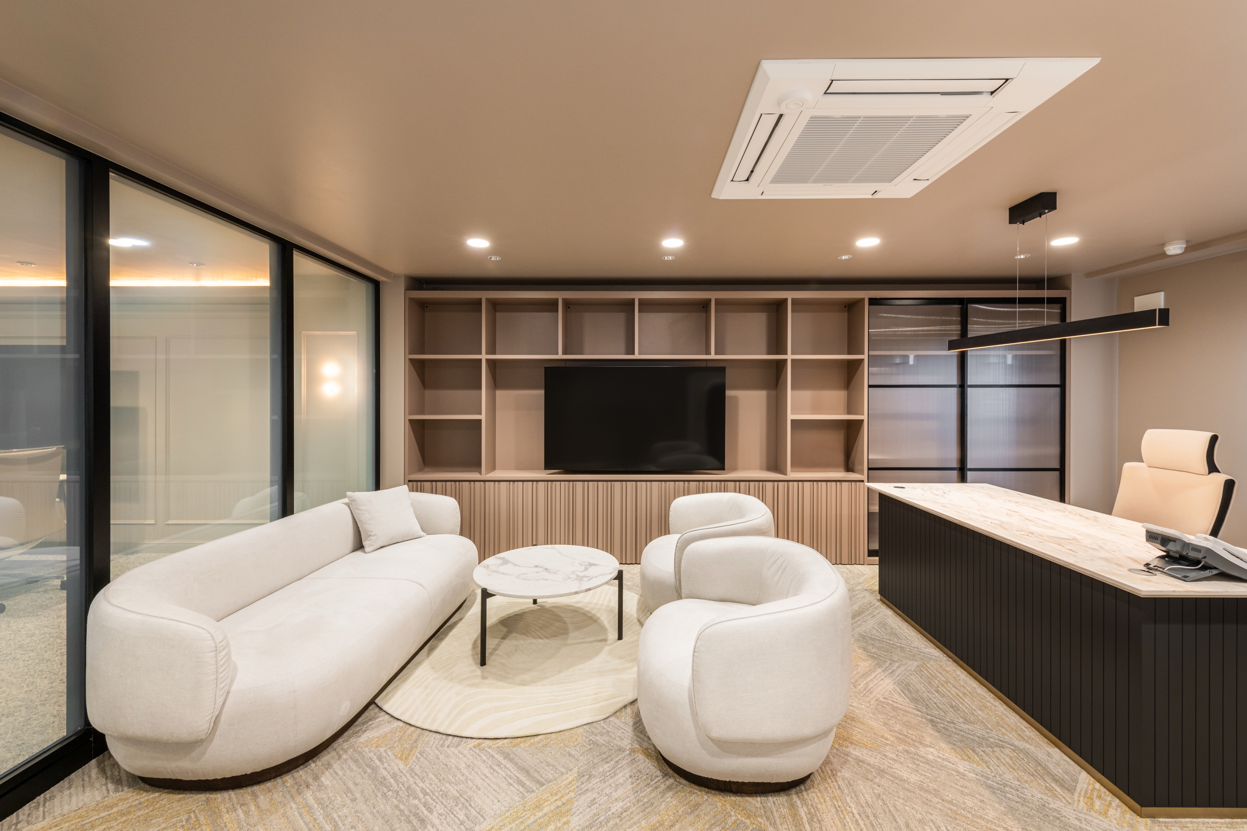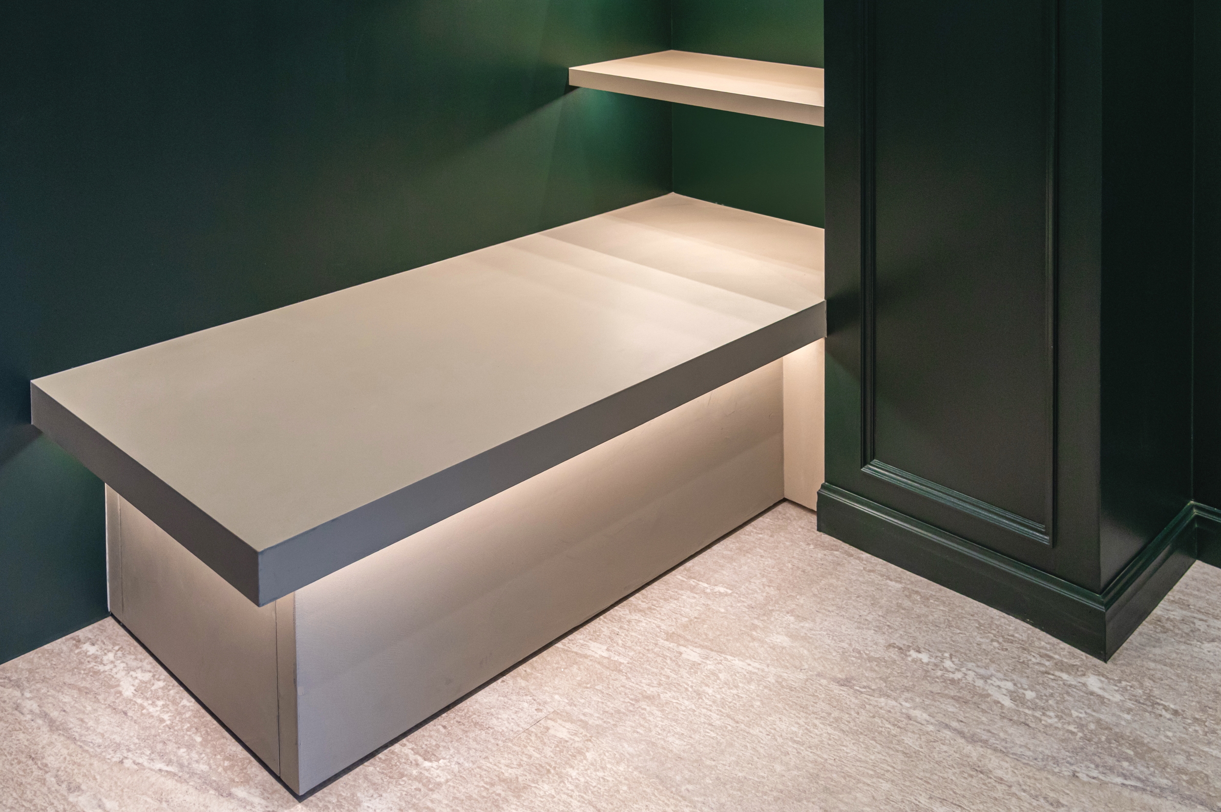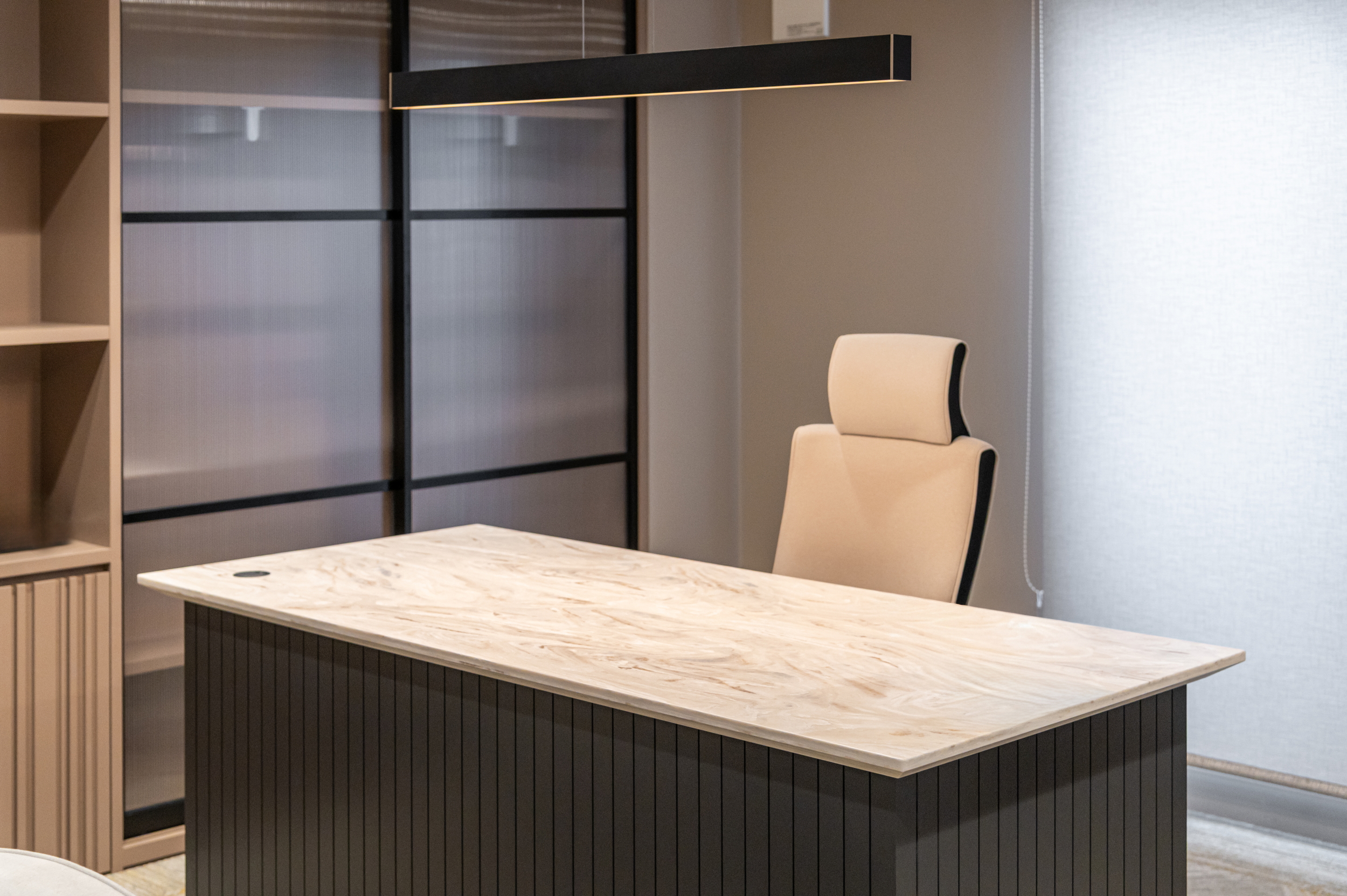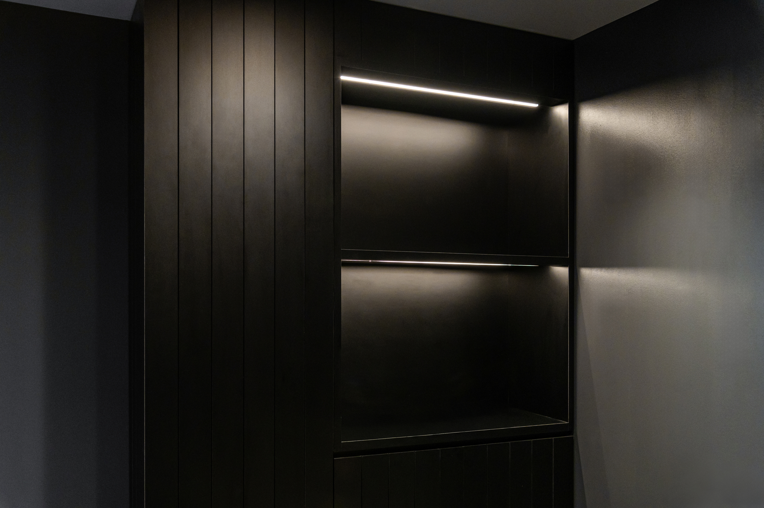 素材の質感や光の陰影で奥行きを作り、落ち着きの中に上質さを感じる空間に仕上げました。